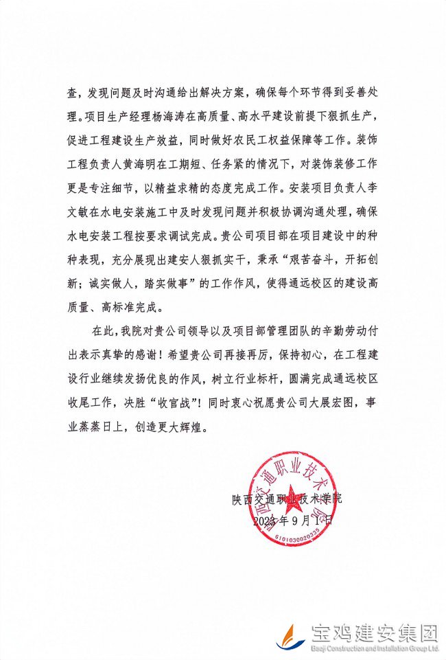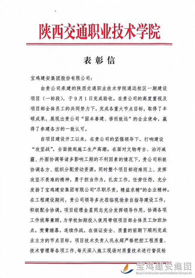 近日,由第十分公司承建的陜西交通職業(yè)技術(shù)學(xué)院新校區(qū)一期項(xiàng)目收到通報(bào)表彰信,對項(xiàng)目建設(shè)過程中相關(guān)管理人員及全體參建者表達(dá)真摯感謝和一致肯定,特別是對寶雞建安集團(tuán)在項(xiàng)目建設(shè)過程中所展現(xiàn)出來的“艱苦奮斗、開拓創(chuàng)新、誠實(shí)做人、踏實(shí)做事”的工作作風(fēng)給予了高度評價(jià)。